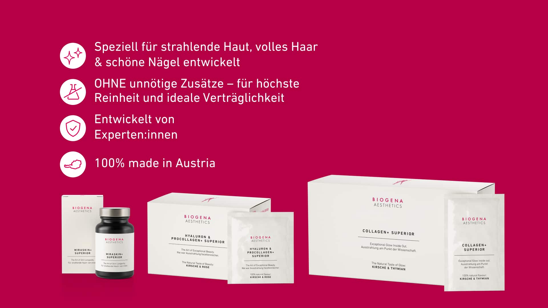 Ob du deiner Haut, deinen Haaren und Nägeln etwas Gutes tun willst oder deinem täglichen Beauty-Boost nachgehst – BIOGENA AESTHETICS unterstützt dich zuverlässig von innen. Unsere Kollagen-Produkte liefern exakt, was dein Körper für strahlende Haut, starke Haare und Nägel braucht: hochwertiges, veganes oder klassisches Kollagen, frei von unnötigen Zusätzen, fundiert durch wissenschaftliche Expertise und entwickelt basierend auf modernsten Erkenntnissen der Mikronährstoffforschung. Hergestellt in Österreich, mit höchster Qualität und Reinheit – für deinen täglichen Glow.